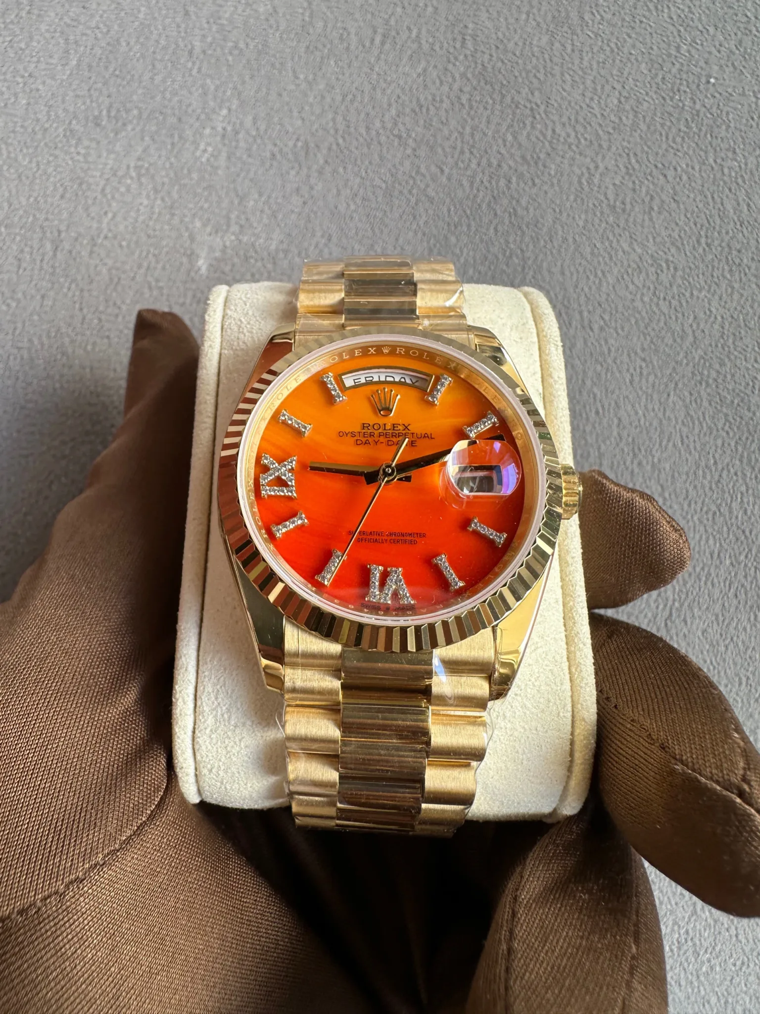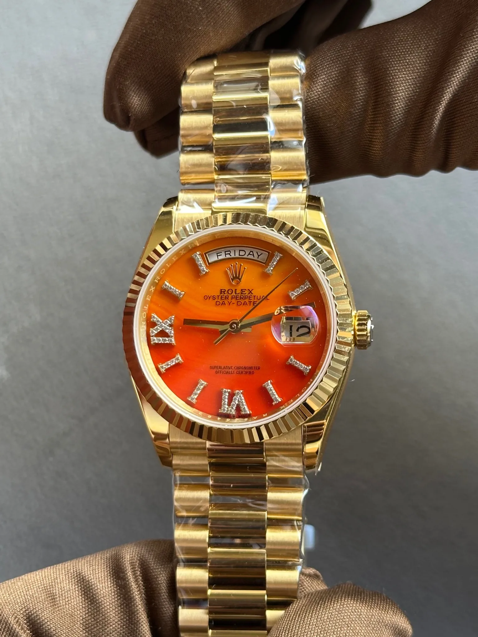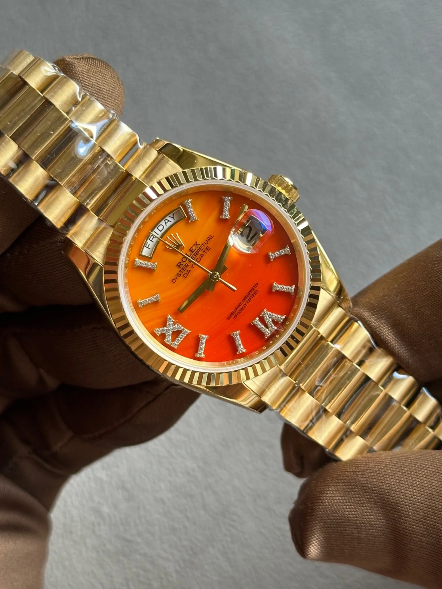 Rolex Day-Date 36 Orange Diamond Dial Full Yellow Gold